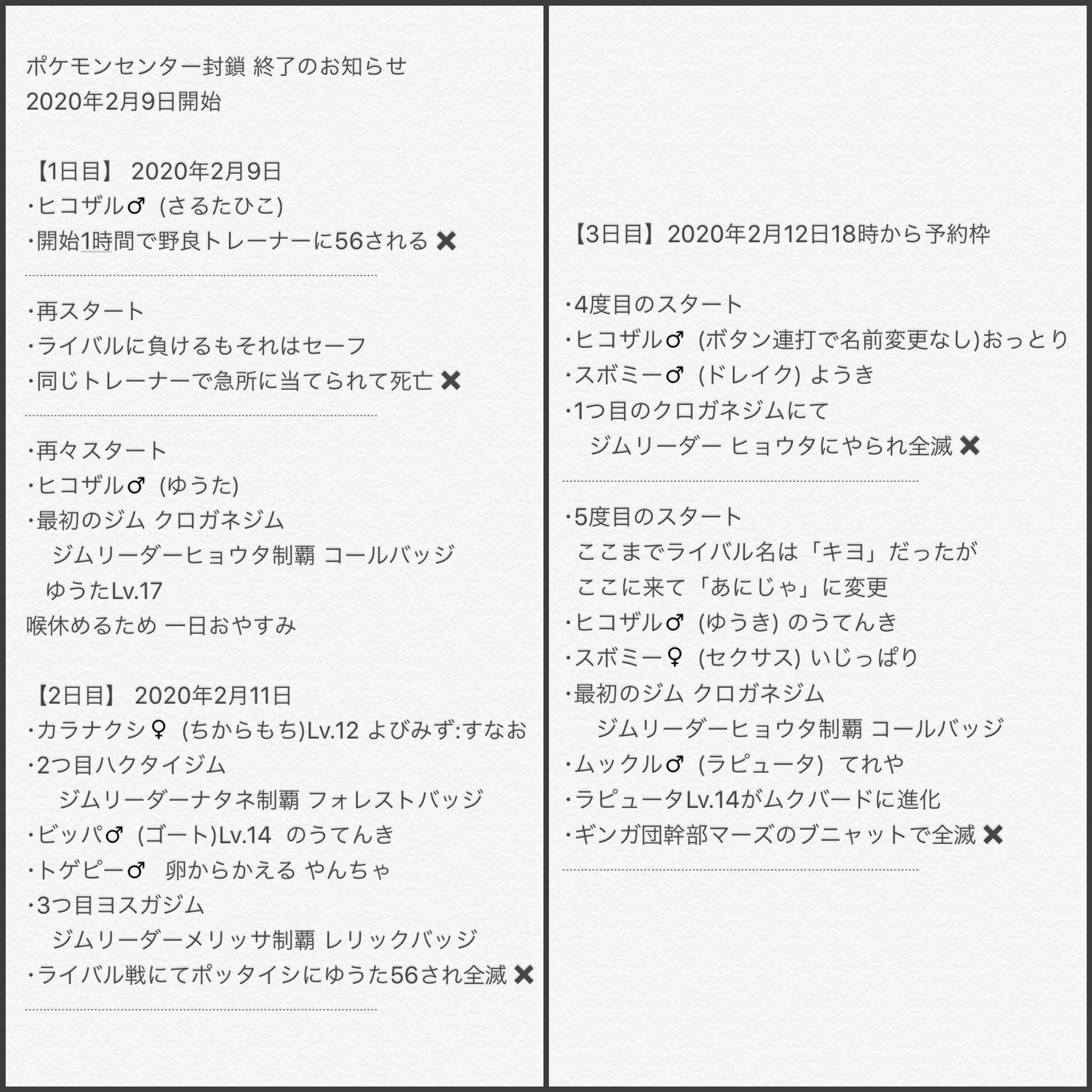 だいく On Twitter ポケセン封鎖プラチナver 2020年2月9日 開始 初日 9日目までの流れまとめ 6回分のチャレンジ 加藤純一 ポケセン封鎖 ポケモンプラチナ
