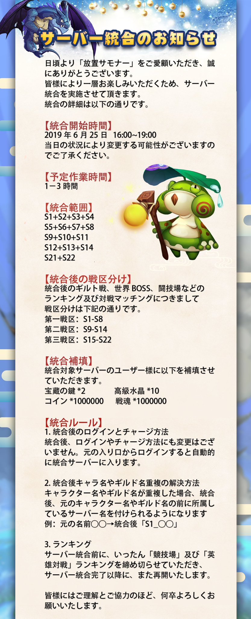 放置サモナー 公式 On Twitter お知らせ 2019年6月25日 火 16 00 19 00でメンテナンスを実施いたします 1 サーバー統合 2 星10英雄の追加 銀の閃光 ファリナ 翔空 魔法エリート 3 新機能 魂の紋章 4 ウォトンとダニアンのステータス調整 5 メイン